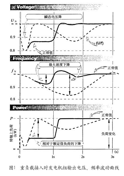 AVR安裝在發(fā)電機(jī)內(nèi),其功能是將因負(fù)載接入造成的輸出電壓跌落值負(fù)反饋地調(diào)控成轉(zhuǎn)子磁場的增強(qiáng),從而促使輸出電壓返回正常值。在此功能上加入負(fù)載調(diào)節(jié)模塊,當(dāng)重負(fù)載使發(fā)動機(jī)主軸轉(zhuǎn)速低于設(shè)定值時,模塊自動調(diào)節(jié)電壓下降一定量,等同于負(fù)載量減少相應(yīng)值,促使發(fā)動機(jī)能較快地達(dá)到額定轉(zhuǎn)速。從而顯著地削弱了由于重負(fù)載接入引起的頻率和電壓波動。如圖1中的實線曲線所示。這就有效地減少了對用電設(shè)備的*。