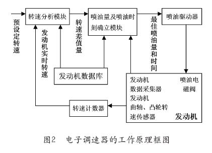 電子調(diào)速器的特點是,它將發(fā)動機(jī)的各功能部件的工作狀態(tài)智能地聯(lián)系并協(xié)同成一個整體,綜合研判它們的實時參數(shù)并求得最佳值,以此作為指令將燃油按照最適宜的時刻和油量由電磁閥(油門)噴入汽缸爆燃,驅(qū)動主軸轉(zhuǎn)動,使發(fā)動機(jī)在額定的輸出功率范圍內(nèi),無論被驅(qū)動負(fù)載怎樣變化,都能以迅速、精確的調(diào)控確保轉(zhuǎn)速穩(wěn)定在25r/s。它的工作程序是:位于主軸和凸輪軸的兩個轉(zhuǎn)速傳感器將信號送至轉(zhuǎn)速計數(shù)器,得出實時的發(fā)動機(jī)轉(zhuǎn)速,并在轉(zhuǎn)速分析模塊與來自數(shù)據(jù)庫的最佳算法及預(yù)設(shè)轉(zhuǎn)速一起解析求出轉(zhuǎn)速差值。噴油量及噴油時刻確立模塊把轉(zhuǎn)速差值、數(shù)據(jù)庫來的典型值和從發(fā)動機(jī)采集的相關(guān)數(shù)據(jù)進(jìn)行全面分析,確立出最佳的噴油量及噴油時刻并指令噴油驅(qū)動器打開噴油電磁閥,使發(fā)動機(jī)既可將燃油充分地爆燃轉(zhuǎn)為驅(qū)動主軸轉(zhuǎn)動的機(jī)械能,又可減少污染物的排放。