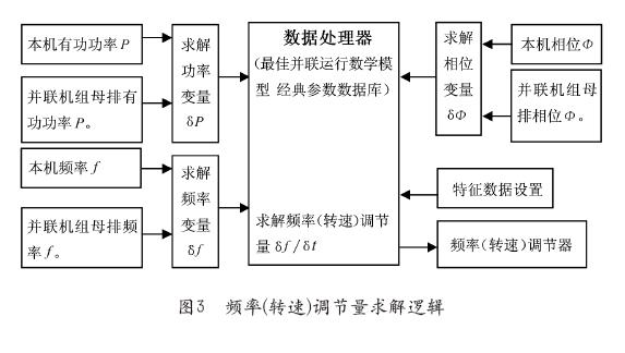 部分負(fù)載接入或撤出并聯(lián)機(jī)組母排的時刻,必然引起有功功率、無功功率在并聯(lián)的各機(jī)組之間重新平分,以致出現(xiàn)機(jī)組環(huán)流和各機(jī)組頻率的波動。此刻,并機(jī)卡將本機(jī)的有功功率、頻率和相位與并機(jī)母排上的相對應(yīng)的這三個參量分別進(jìn)行求解,得到有功功率變量δP、頻率變量δf和相位變量δΦ。數(shù)據(jù)處理器依照最佳并聯(lián)運行數(shù)學(xué)模型及經(jīng)典數(shù)據(jù)對它們計算、推演,求解出調(diào)節(jié)頻率最佳數(shù)值δf/δt作用于頻率(轉(zhuǎn)速)調(diào)節(jié)器和電子調(diào)速器,改變發(fā)動機(jī)主軸、發(fā)電機(jī)轉(zhuǎn)子的轉(zhuǎn)速,使本機(jī)組頻率及有功功率的均分達(dá)到并聯(lián)機(jī)組良好運行的條件。