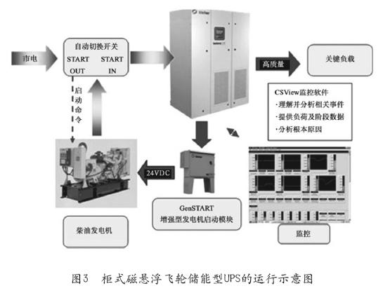 在傳統(tǒng)UPS供電系統(tǒng)中,當(dāng)電力發(fā)生中斷時(shí),蓄電池會(huì)支撐系統(tǒng)正常運(yùn)轉(zhuǎn),與此同時(shí),柴油發(fā)動(dòng)機(jī)開(kāi)始啟動(dòng),以此保證數(shù)據(jù)中心主機(jī)正常工作、空調(diào)連續(xù)運(yùn)轉(zhuǎn)。蓄電池型UPS在此過(guò)程中,提供了“分鐘級(jí)”的電力供電。而飛輪儲(chǔ)能型UPS受制于機(jī)械儲(chǔ)能,僅僅能夠提供30s到1min電力供電,這也是飛輪UPS被詬病的主要原因。然而,專家指出,如今,市電電源的可靠性達(dá)到99.9%,有些重要的負(fù)載都采用雙路市電供電,市電的可靠性可以說(shuō)已經(jīng)達(dá)到了99.99%。萬(wàn)一市電中斷,后備電源的可靠性也可以達(dá)到99.9%,從市電到后備電源的切換,在技術(shù)上只需要10s的時(shí)間,這是一個(gè)公開(kāi)的標(biāo)準(zhǔn)。目前,歐洲可做到8s??梢詳喽?飛輪儲(chǔ)能型UPS能提供30s的電力完全能夠滿足從市電到后備電源的可靠切換的要求。圖3給出了柜式磁懸浮飛輪儲(chǔ)能型UPS的運(yùn)行示意圖。